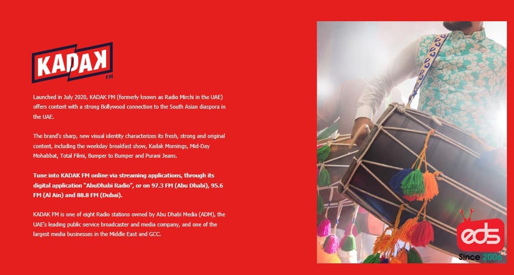 Launched in July 2020, KADAK FM (formerly known as Radio Mirchi in the UAE) offers content with a strong Bollywood connection to the South Asian diaspora in the UAE.